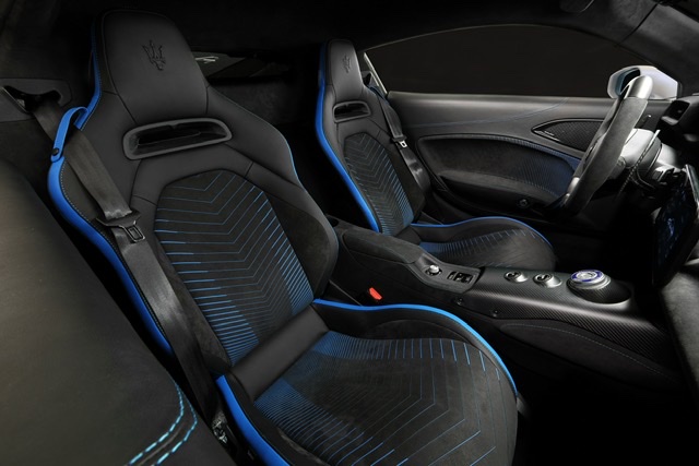 เมื่ออยู่ในห้องโดยสาร ผู้ขับก็เป็นเสมือนจุดศูนย์กลาง โดยไม่มีสิ่งใดมารบกวนประสบการณ์ขับแบบสปอร์ต อุปกรณ์ทุกชิ้นผ่านการออกแบบและติดตั้งอย่างมีจุดประสงค์ เน้นดีไซน์เรียบง่าย ไร้สันคม เพื่อไม่ให้รบกวนสมาธิผู้ขับ ติดตั้งจออเนกประสงค์ขนาด 10 นิ้ว บริเวณเรือนไมล์ และอีกตัวบริเวณกลางแดชบอร์ดสำหรับระบบ Maserati Touch Control Plus (MTC Plus MIA) ขณะที่คอนโซลกลางตกแต่งด้วยคาร์บอนไฟเบอร์ ก็ดูเรียบง่าย พร้อมฟังก์ชั่นการใช้งานที่จำเป็น อาทิ จุดชาร์จสมาร์ทโฟนแบบไร้สาย, ปุ่มปรับ 5 โหมดการขับ (GT, Wet, Sport, Corsa และ ESC Off ที่ตัดการทำงานของระบบควบคุมเสถียรภาพ), 2 ปุ่มเลือกความเร็วในการขับ, ปุ่มปรับกระจกไฟฟ้า และปุ่มควบคุม Multimedia System รวมถึงมีช่องเก็บของบริเวณใต้ที่พักแขน ส่วนปุ่มควบคุมอื่นๆ ติดตั้งอยู่บนพวงมาลัย ขนาบข้างด้วยปุ่มสตาร์ทเครื่องยนต์ทางซ้าย และปุ่ม launch control ทางขวา