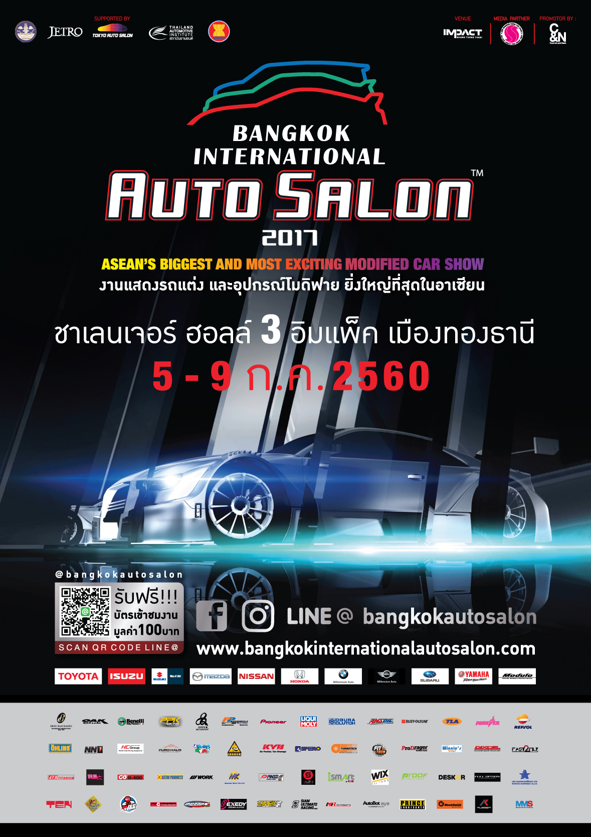 จัดเต็มกับงานจำหน่ายรถยนต์ตกแต่งพิเศษและอุปกรณ์โมดิฟายใหญ่ที่สุดของประเทศไทยและอาเซียน “บางกอก อินเตอร์เนชั่นแนล ออโต ซาลอน 2017” ครั้งที่ 5 (The 5th BANGKOK INTERNATIONAL AUTO SALON 2017) โดย “บริษัท คอร์โนแอนด์แนช จำกัด” ในเครือ “บริษัท สยามสปอร์ต ซินดิเคท จำกัด (มหาชน)” ผนึกกำลังค่ายรถยนต์และค่ายอุปกรณ์โมดิฟายชุดแต่งชั้นนำระดับโลก นำความยิ่งใหญ่กลับมาอีกครั้งกับบรรยากาศแห่งเทศกาลยานยนต์ ไฮไลท์รถแต่งพิเศษ อิมพอร์ตจากเอเซีย ครบถ้วน “คัสตอมคาร์” จากงาน “โตเกียวออโตซาลอน” เสริมทัพด้วยรถแต่งจากสำนักแต่งชั้นนำของอาเซียน พบค่ายรถยนต์ชื่อดังและสินค้ายานยนต์ราคาพิเศษตลอดทั้งงาน และความบันเทิงสุดเร้าใจจากต่างประเทศ ตอบโจทย์ทุกความคุ้มโปรโมชั่นพิเศษแบบ “มิดเยียร์เซลล์” พร้อมนำนวัตกรรมออนไลน์เอ็กซ์ซิบิชั่นเพื่อเข้าถึงกลุ่มผู้บริโภคในโลกออนไลน์ ระหว่างวันที่ 5-9 กรกฎาคม 2560 ณ อาคารชาเลนเจอร์ 3 อิมแพค เมืองทองธานี