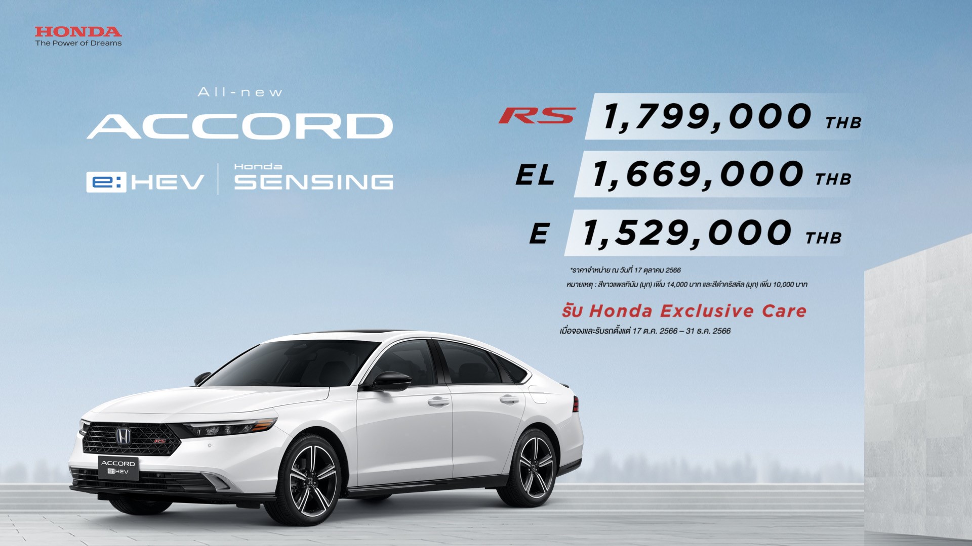 • ฮอนด้า แอคคอร์ด อี:เอชอีวี ใหม่ ราคาจำหน่าย รุ่น e:HEV E 1,529,000 บาท  รุ่น e:HEV EL ราคา 1,669,000 บาท และรุ่น e:HEV RS ราคา 1,799,000 บาท