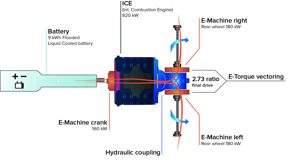 Koenigsegg Regera ใช้เครื่องยนต์แบบ V8 ขนาด 5.0 ลิตร Twin Turbo แรงม้าสูงสุดสูงถึง 1,100 แรงม้า ที่ 7,800 รอบต่อนาที โดยมี Red line ที่ 8,250 รอบต่อนาที แรงบิดสูงสุดมหาศาลถึง 1,280 Nm ที่ 4100 รอบต่อนาที ทำงานร่วมกับมอเตอร์ไฟฟ้าสามตัว ติดตั้งอยู่ที่ล้อคู่หลังและเพลาข้อเหวี่ยง โดยมอเตอร์ไฟฟ้า 1 ตัวเพื่อผลิตพลังไฟฟ้าและเป็นมอเตอร์สตาร์ท ส่วนมอเตอร์ไฟฟ้าอีก 2 ตัว ติดตั้งแยกในแต่ละล้อซ้ายขวา พร้อมแบตเตอรี่แบบระบายความร้อนด้วยน้ำขนาด 9.27 Kwh ติดตั้งใจกลางรถ เมื่อชาร์จเต็มสามารถวิ่งแบบไฟฟ้าล้วนได้ถึง 50 กิโลเมตร พลังจากมอเตอร์ไฟฟ้าทั้งหมดสูงถึงแรงม้า 700 แรงม้า กับแรงบิด 820 Nm เมื่อรวม 2 ระบบนี้เข้าด้วยกันแล้ว ทำให้ได้แรงม้ามหาศาลออกมากกว่า 1,800 แรงม้า และแรงบิดสูงสุดมากกว่า 2,000 Nm ทำงานร่วมกับระบบ Koenigsegg Direct Drive (KDD) โดย Christian Von Koenigsegg และ Koenigsegg Advanced Engineering Team เป็นผู้คิดค้นขึ้น โดยกำลังจะถูกถ่ายทอดไปยังล้อคู่หลังโดยตรงแบบ Single Speed ตัดปัญหาการสูญเสียพละกำลังระหว่างทางลงไปได้อย่างมาก