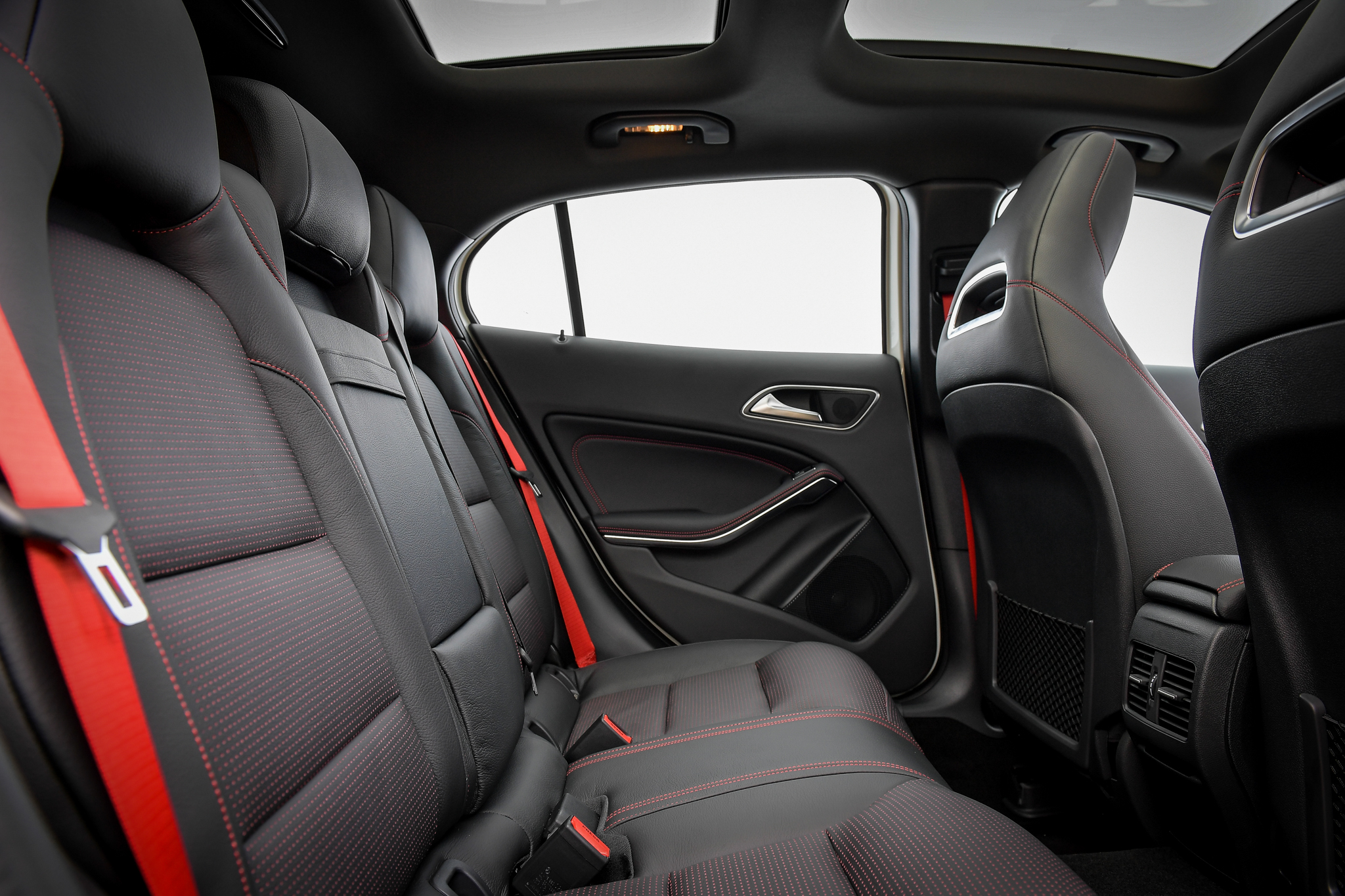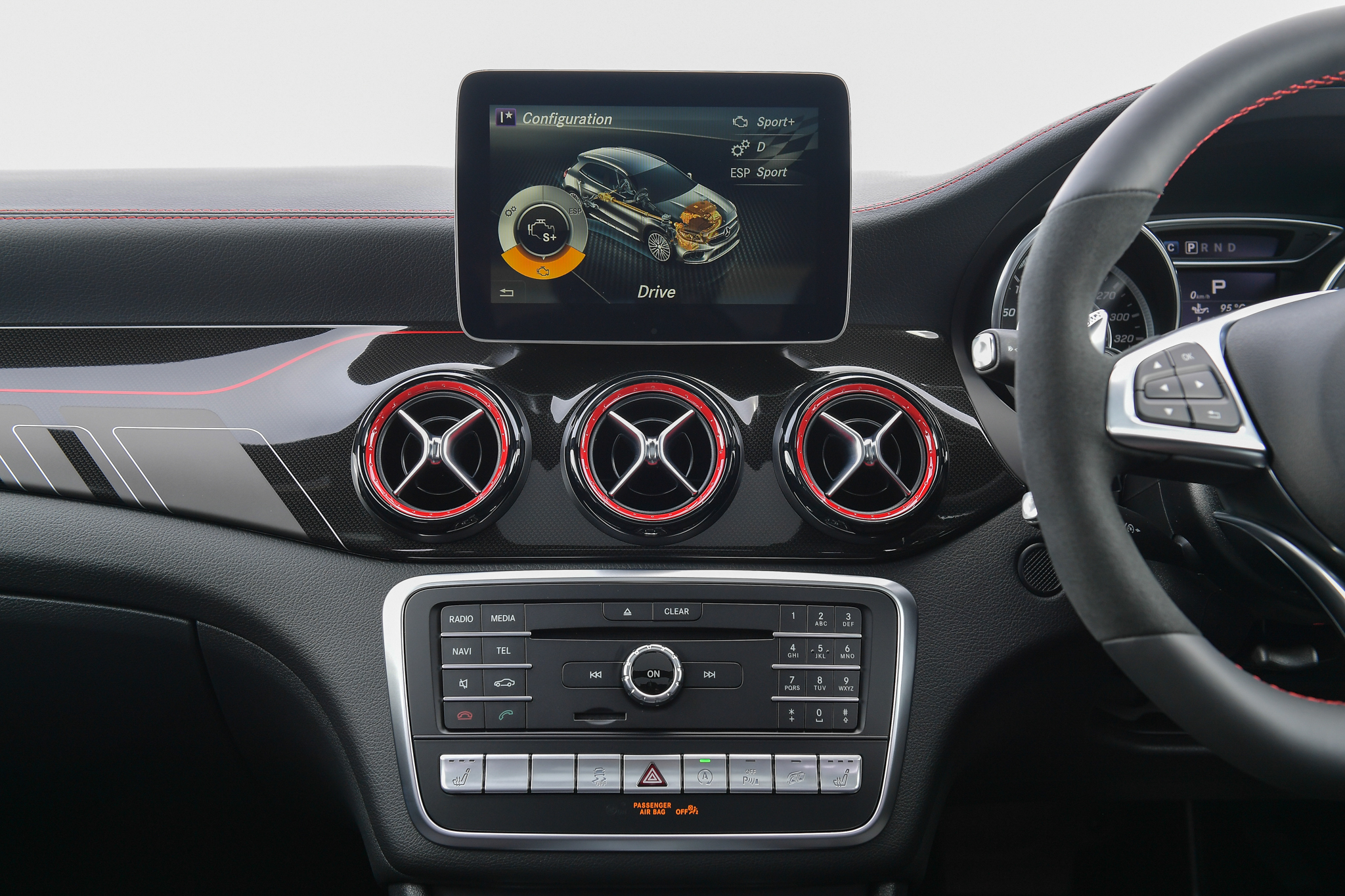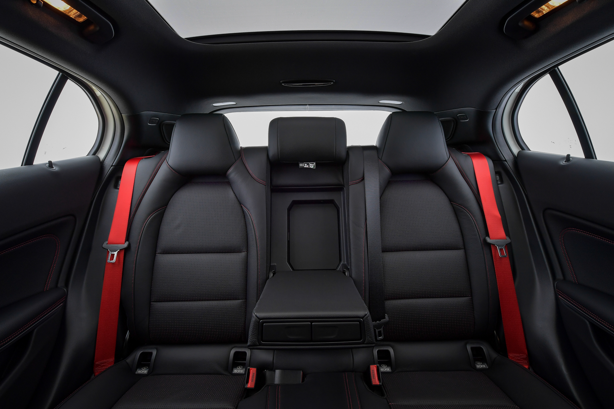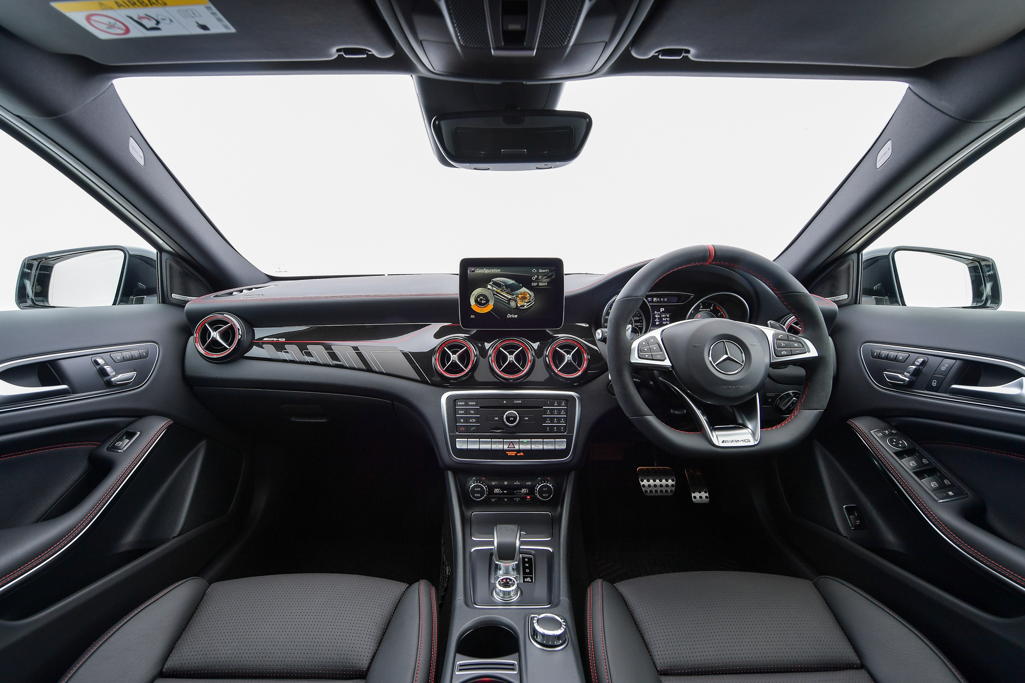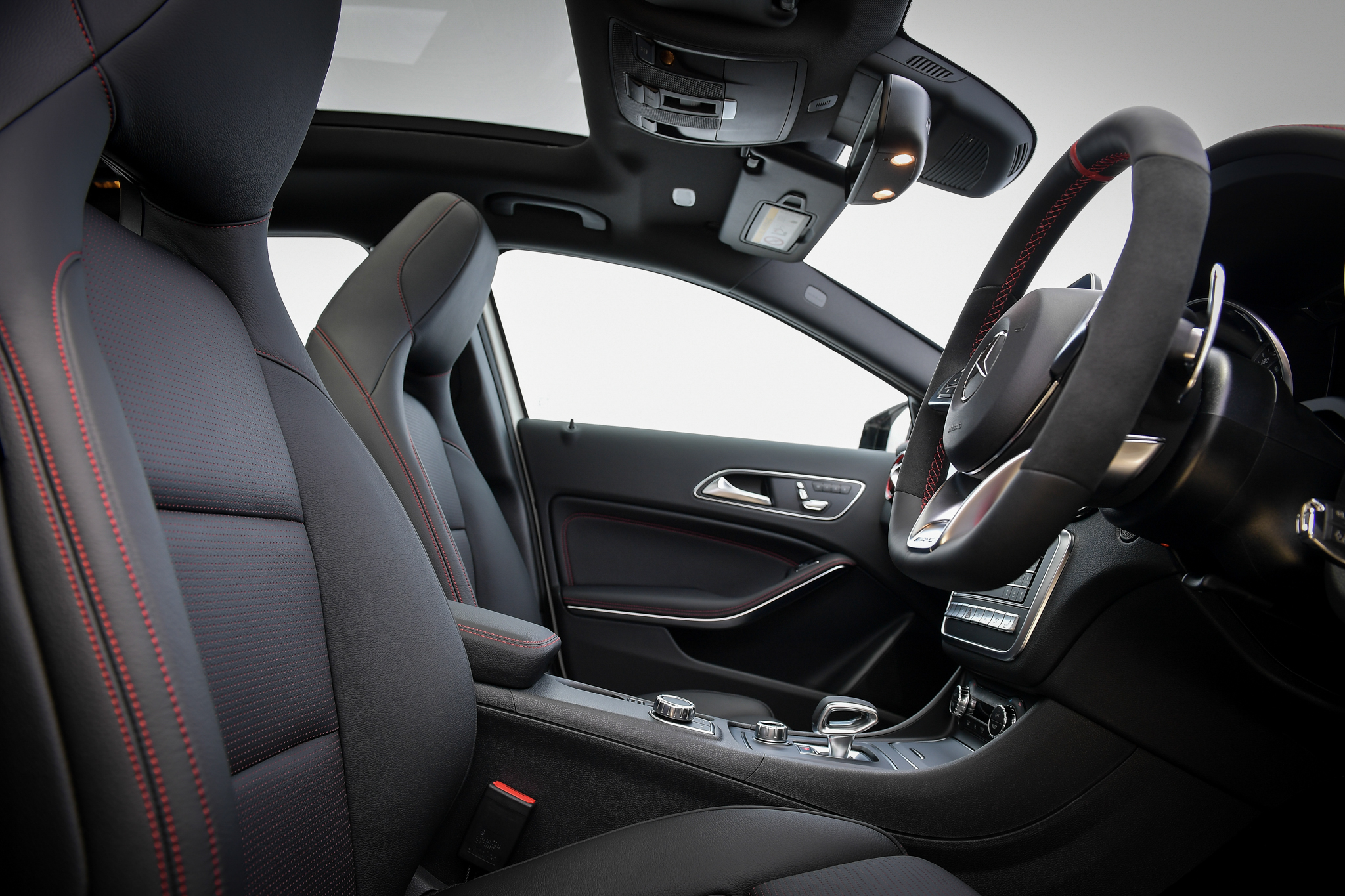 สำหรับดีไซน์ภายในของ Mercedes-AMG GLA 45 4MATIC นั้น โดดเด่นด้วยเบาะที่นั่งหุ้มหนังแบบสปอร์ต โดยเบาะนั่งสำหรับผู้ขับขี่และผู้โดยสารด้านหน้าปรับระดับด้วยระบบไฟฟ้า พร้อมหน่วยบันทึกความจำ และระบบอุ่นร้อน, ชุดคันเร่งและแป้นเบรกแบบสปอร์ต, พวงมาลัยแบบพิเศษ AMG Performance Steering Wheel Nappa / DINAMICA ที่เพิ่มความกระชับและมั่นใจตลอดการขับขี่ ตกแต่งภายในด้วย AMG Design trim in black / red แบบ CARBON FIBRE ที่คมเข้มดุดัน มาพร้อมกับเข็มขัดนิรภัยสีแดงที่เข้ากับสีเบาะ ทำให้ได้อารมณ์สปอร์ต น่าหลงใหล, กาบบันไดเรืองแสงประตูหน้าแบบ AMG และ AMG DYNAMIC SELECT, ล้ออัลลอยดีไซน์สปอร์ตจาก AMG แบบ 10 ก้าน ขนาด 20” และอุปกรณ์มัลติมีเดีย อย่าง วิทยุ-ซีดี MB Audio 20, หน้าจอแบบยกตัว ขนาด 8 นิ้ว พร้อมเพิ่มความรื่นรมย์ตลอดการขับขี่ด้วยเครื่องเสียงแบบ Harman Kardon® Logic 7® surround sound system ที่ให้เสียงรอบทิศทาง, ระบบสำหรับเชื่อมต่อโทรศัพท์เคลื่อนที่ (Bluetooth), ระบบนำทาง GARMIN MAP PILOT รวมถึงหลังคาพาโนรามิค ซันรูฟ เลื่อนเปิด-ปิดได้ด้วยระบบไฟฟ้า