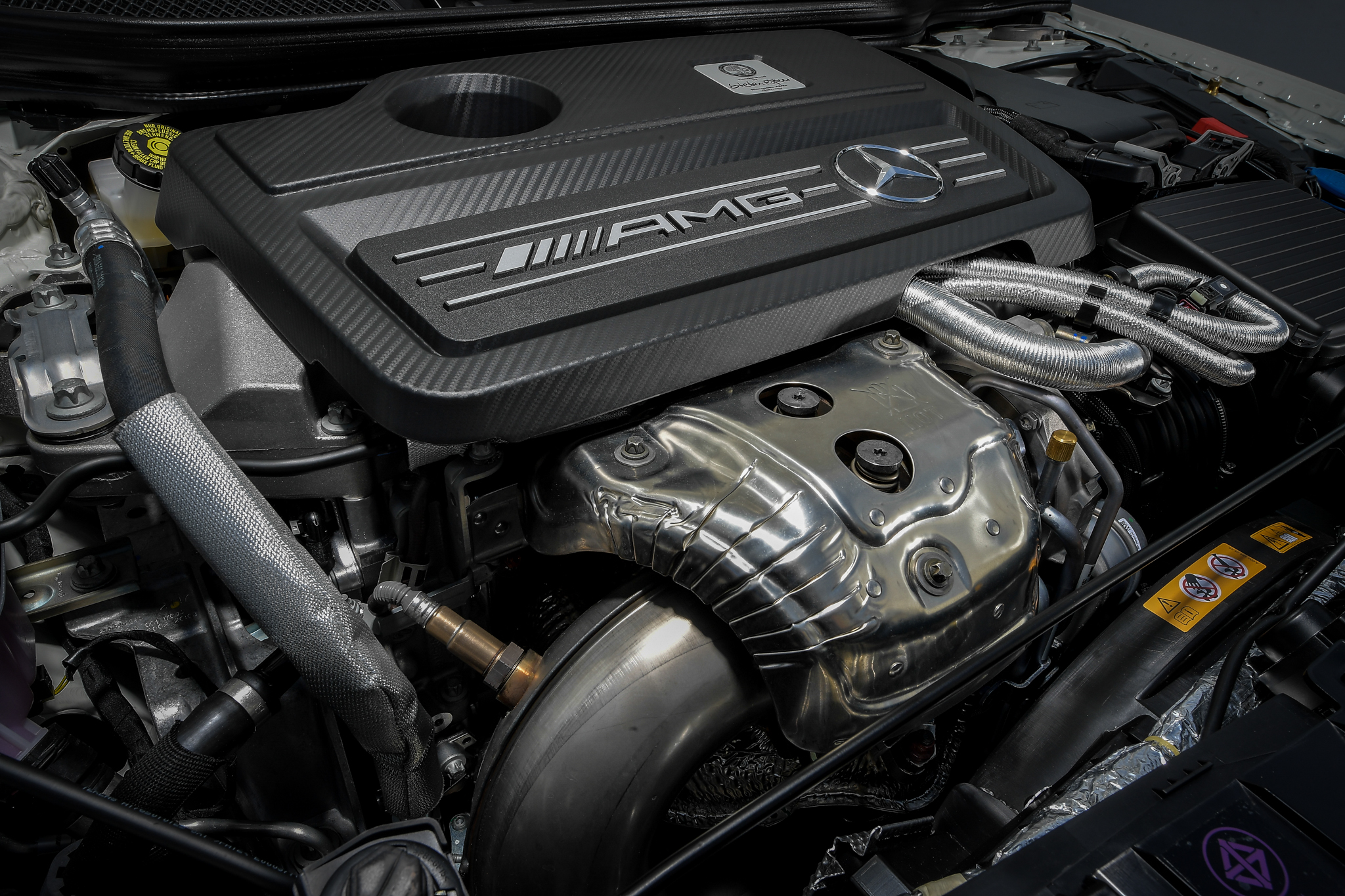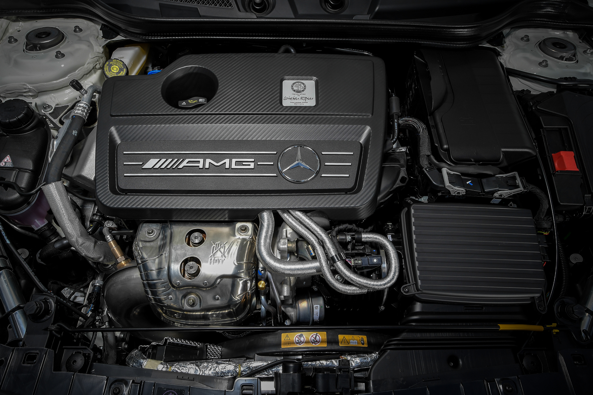 หนึ่งในคุณสมบัติอันล้ำสมัยของเครื่องยนต์ 4 สูบพร้อมเทอร์โบชาร์จเจอร์ที่เมอร์เซเดส–เอเอ็มจีเลือกใช้กับรถยนต์ Mercedes-AMG GLA 45 4MATIC โฉมใหม่คือหัวฉีดน้ำมันแบบตรงที่สามารถฉีดน้ำมันเป็นละอองได้ กล่าวคือ หัวฉีดแบบเพียร์โซนั้นจะติดตั้งอยู่ที่จุดกึ่งกลางของกระบอกสูบทั้ง 4 กระบอกและสามารถฉีดน้ำมันได้แม้ในกระบอกสูบจะมีความดันสูงถึง 200 บาร์ การฉีดน้ำมันและการจุดระเบิดได้หลายครั้งต่อจังหวะการเคลื่อนที่ของกระบอกสูบ 1 รอบนั้นช่วยประหยัดพลังงาน อีกทั้งยังช่วยเพิ่มประสิทธิภาพการทำงานด้านอุณหพลศาสตร์ (thermodynamic) ของเครื่องยนต์ จึงช่วยลดปริมาณไอเสียที่เกิดจากกระบวนการเผาไหม้ได้เป็นอย่างมาก ระบบเทอร์โบชาร์จเจอร์แบบมีทางเดินไอเสีย 2 ช่อง (Twin-scroll) ที่ทำงานอย่างสอดประสานกับระบบควบคุมการจ่ายน้ำมันและการปล่อยไอเสียนั้นช่วยปรับปรุงกระบวนการ อัดอากาศที่ส่งผลโดยตรงต่อประสิทธิภาพของระบบเทอร์โบชาร์จเจอร์ช่วยให้เครื่องยนต์ตอบสนองได้อย่างที่ผู้ขับขี่ปรารถนามากที่สุด